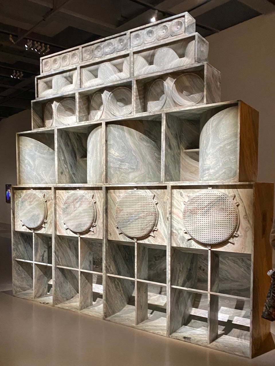 “SOUND SYSTEM (2025) is a tribute to music and its power to bring people together. Nari Ward uses marble, a stone formed under pressure, to reflect how struggle and hardship have shaped music. The work is inspired by Jamaican sound systems, which turned empty spaces into places of community and resistance, despite racism and poverty. These sound systems influenced global music, including hip-hop. Ward’s marble sculpture connects the folk traditions of Jamaica with the rich culture of Harlem, New York, where he has lived and worked for many years. Ward is known for sculptural installations made from discarded neighborhood materials, reimagining everyday objects to highlight issues of race, poverty, and consumer culture.”